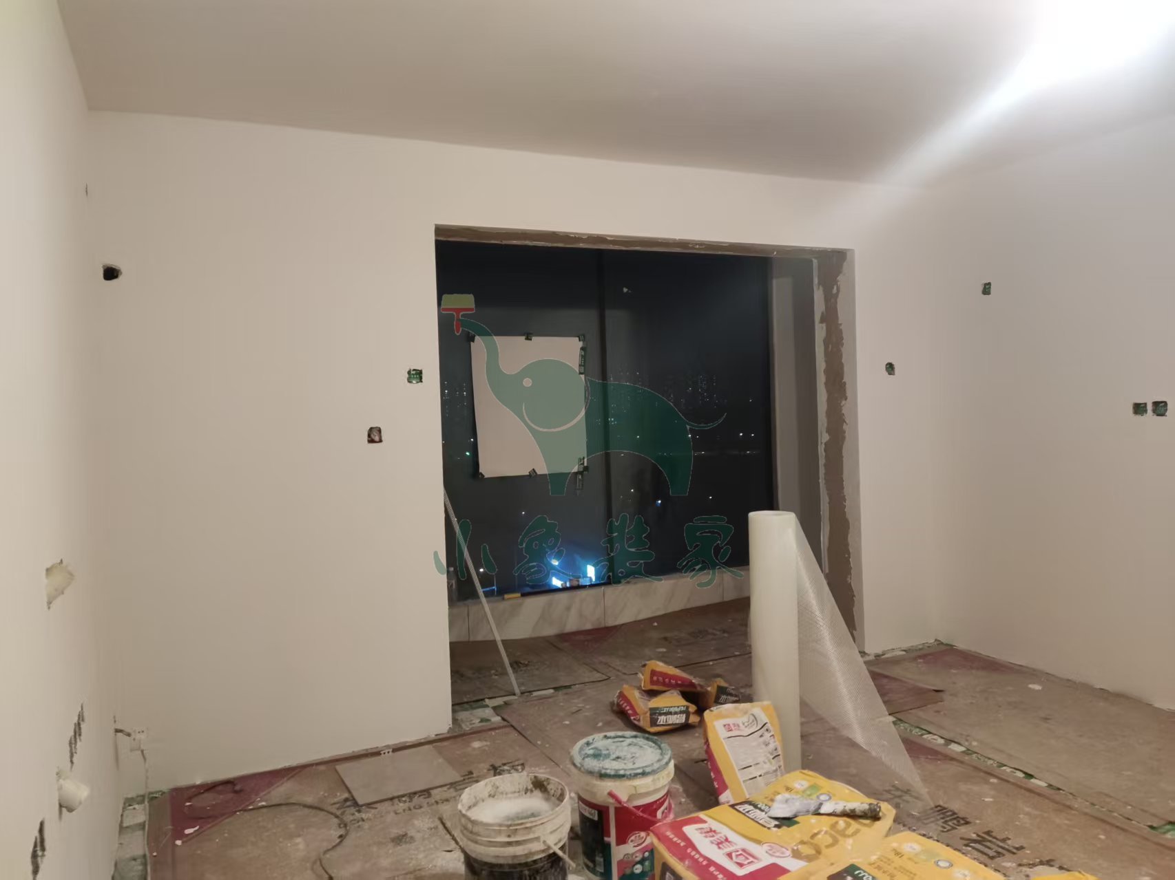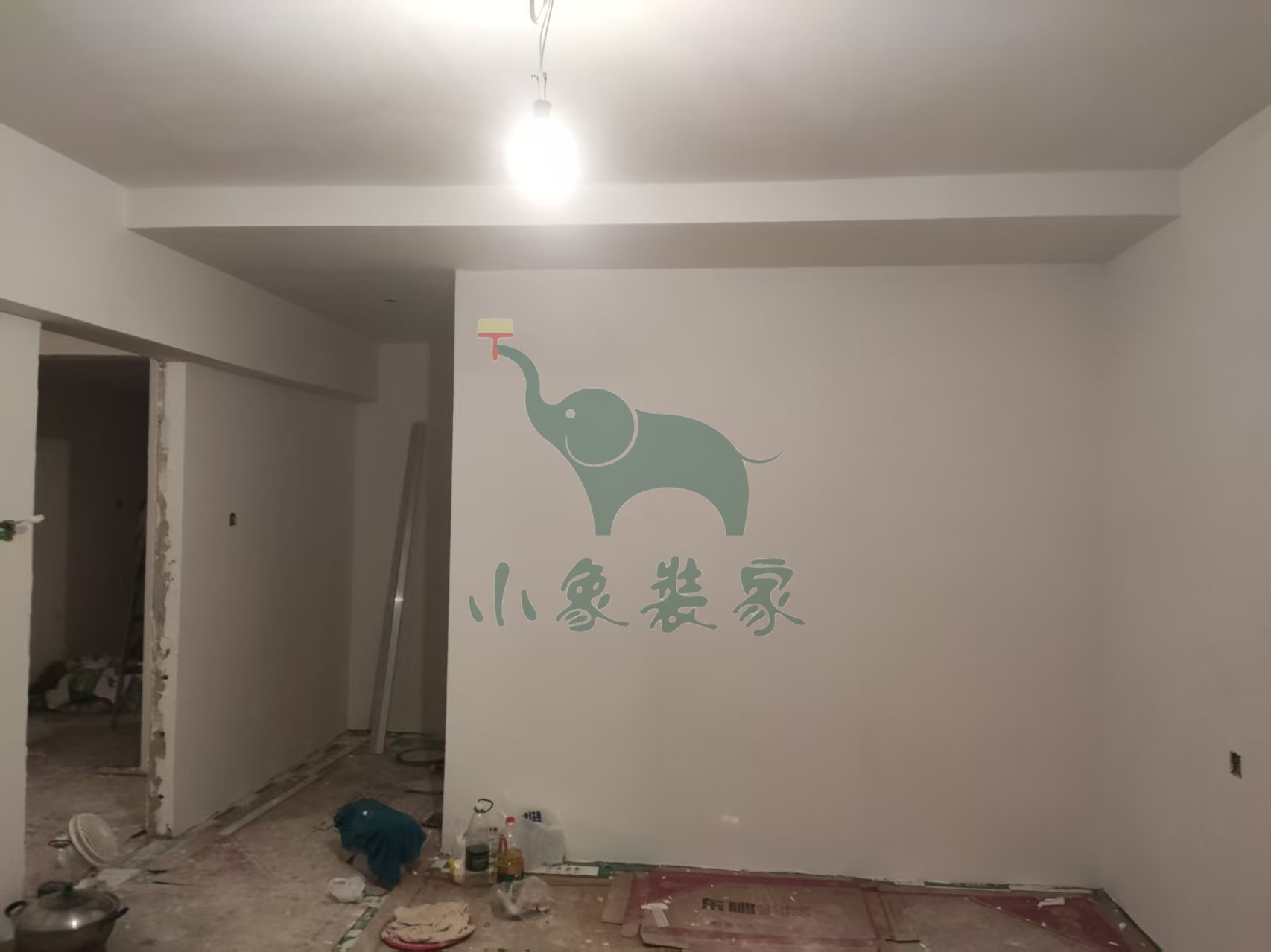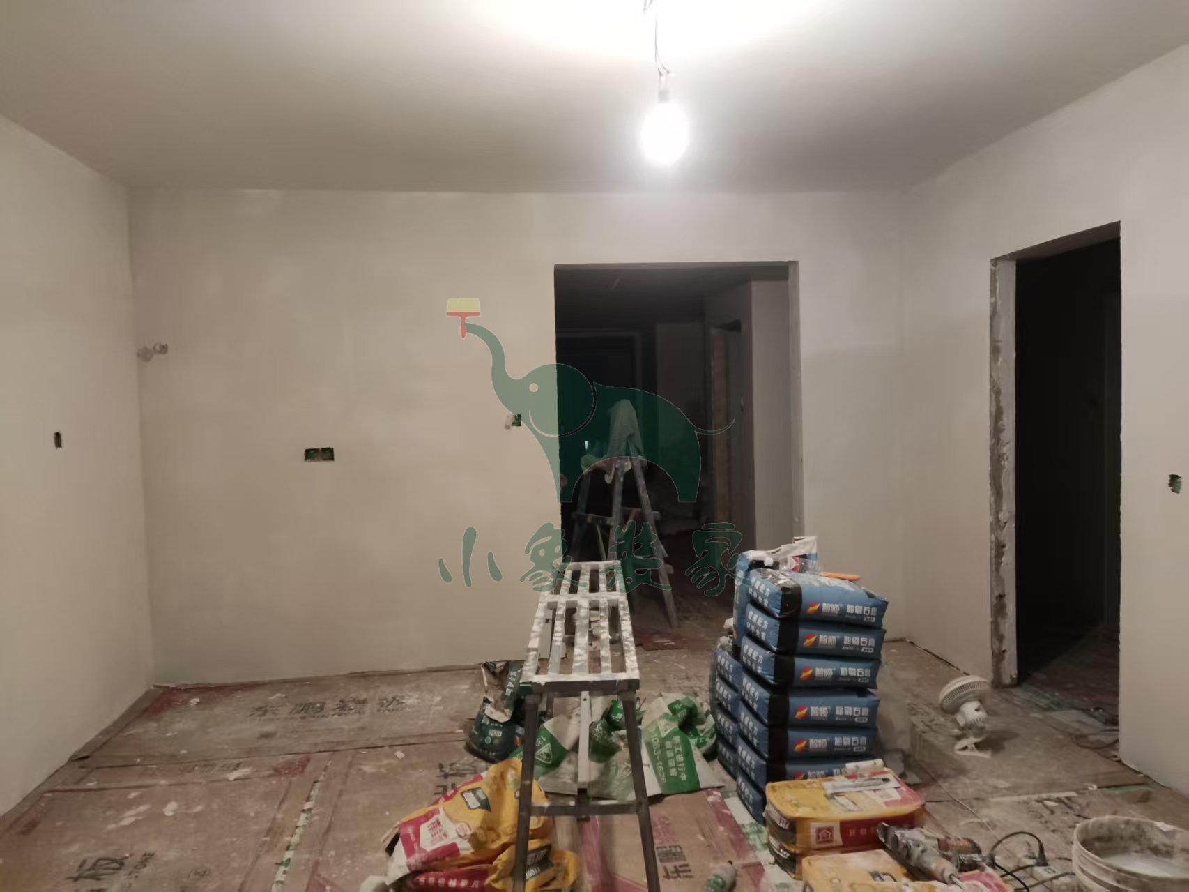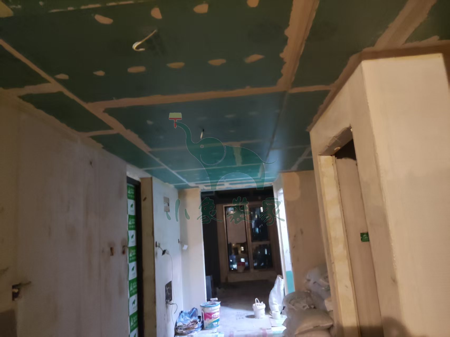 油工工程-墙面、顶面石膏找平还需2天。