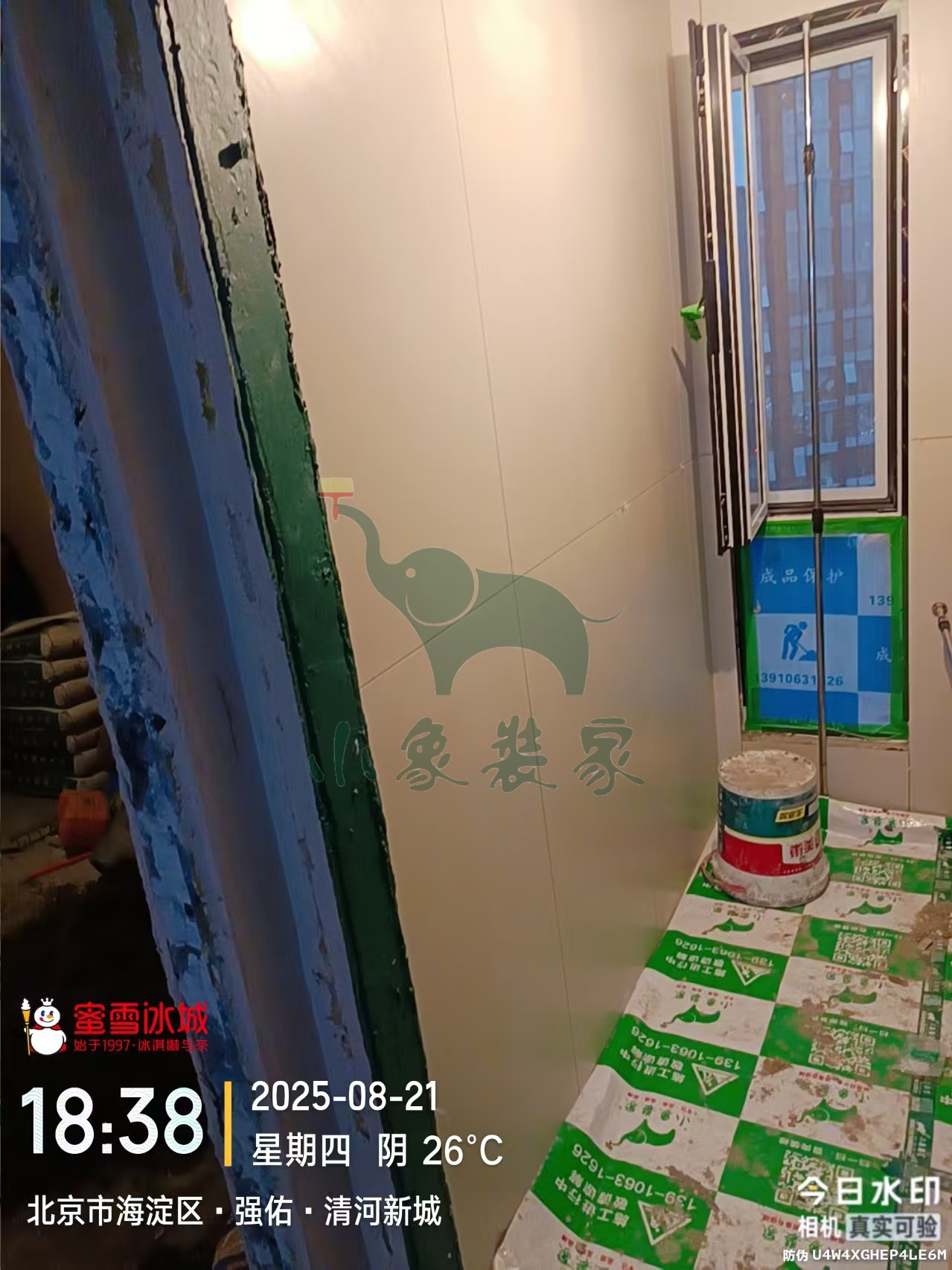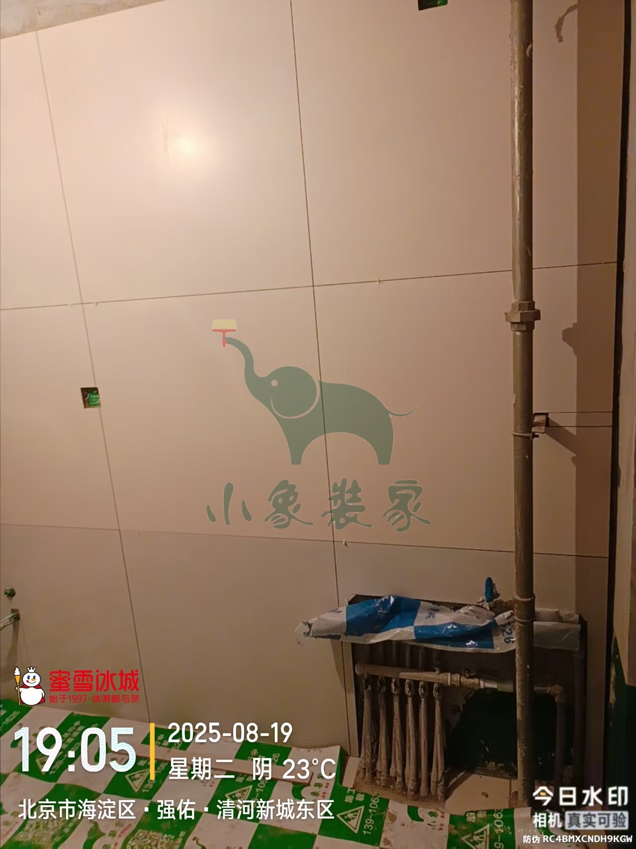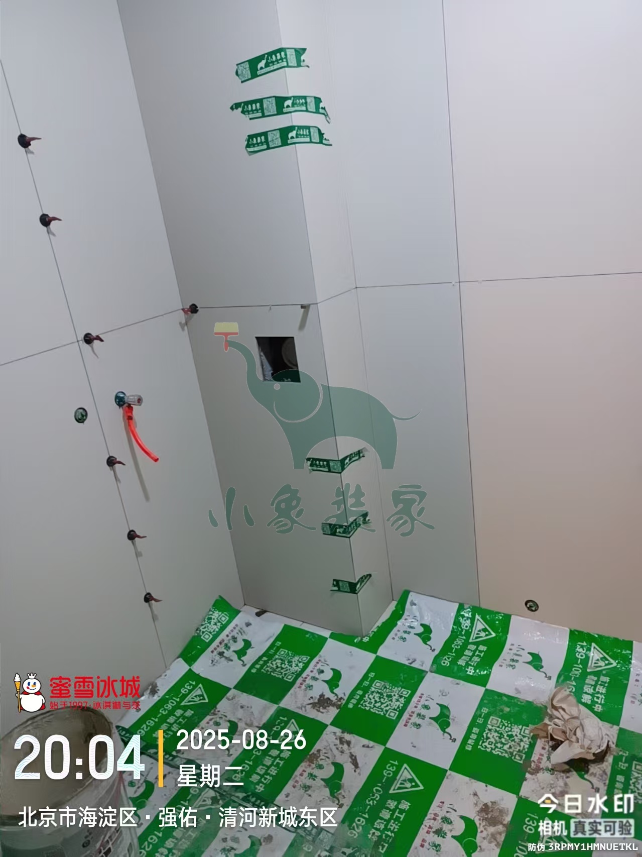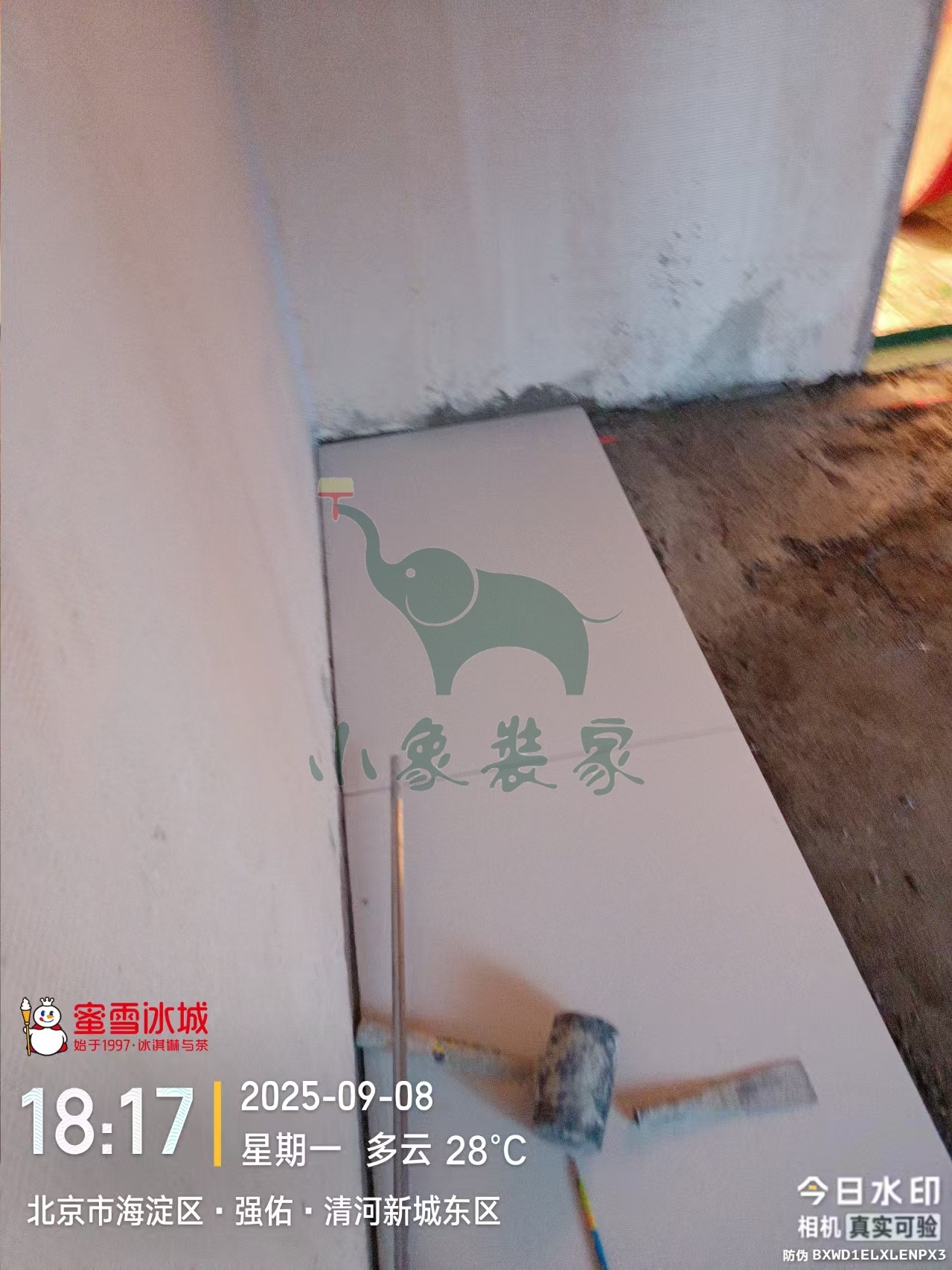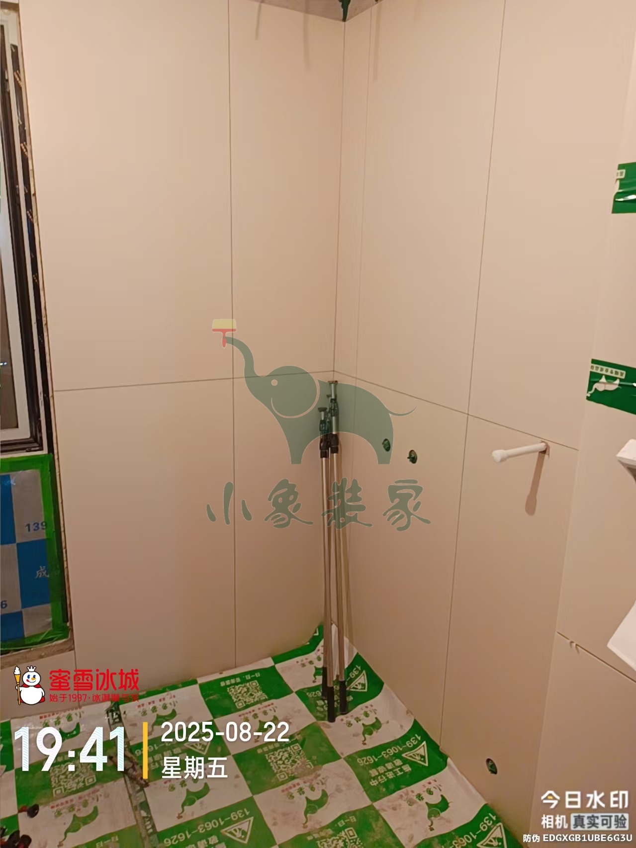 瓦工工程-卫生间墙砖铺贴还需1天。